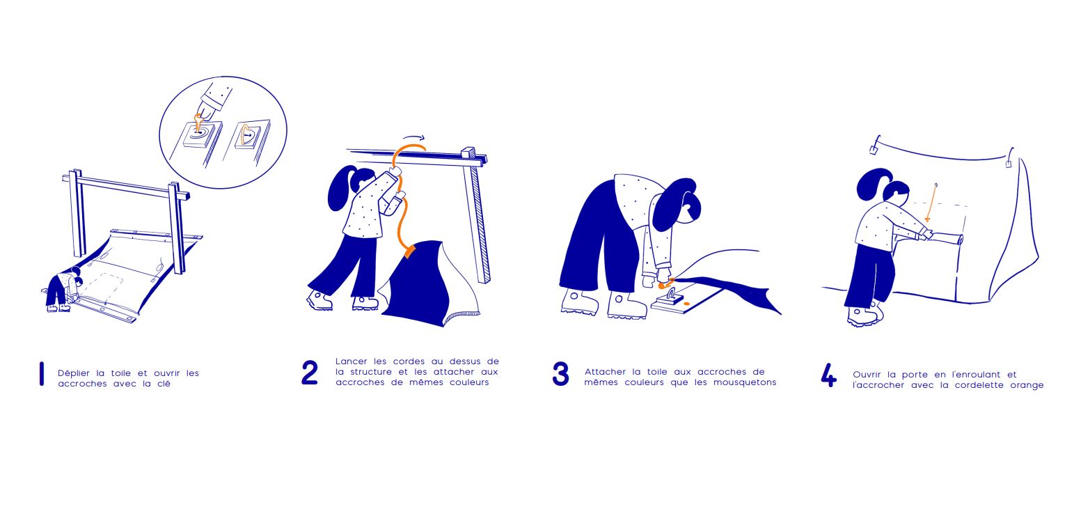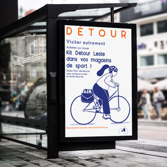 Détour est un projet né de l’envie de démocratiser le voyage à vélo et de valoriser le slow-tourisme. Constatant les freins et envies des usagers, Doriane imagine une gamme de mobiliers modulables, fonctionnels et sécurisés pour cyclistes. Cette gamme comprend, un banc qui sécurise les affaires et le vélo, ainsi qu’un kit pour construire une tente.
